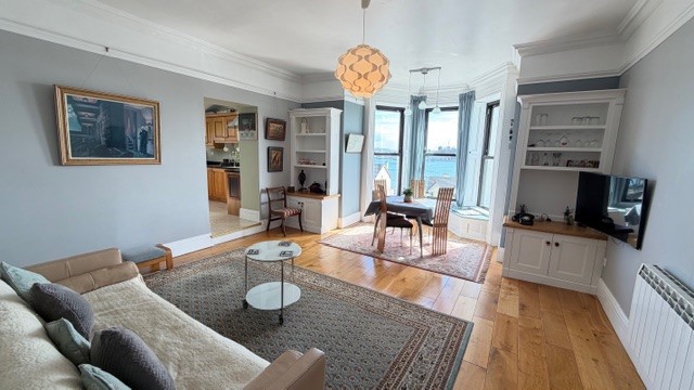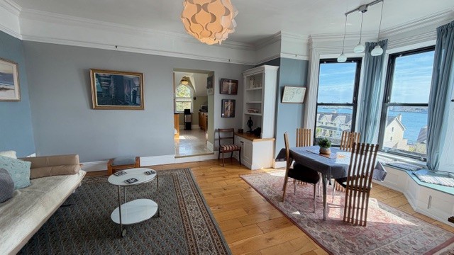 The accommodation is thoughtfully laid out and generously proportioned throughout. Upon entry, you are welcomed by a bright and spacious entrance hall that leads into a large sitting room, complete with a charming bay window that perfectly frames the stunning harbour views. The adjoining kitchen is well-appointed and practical, offering ample space for everyday living.
