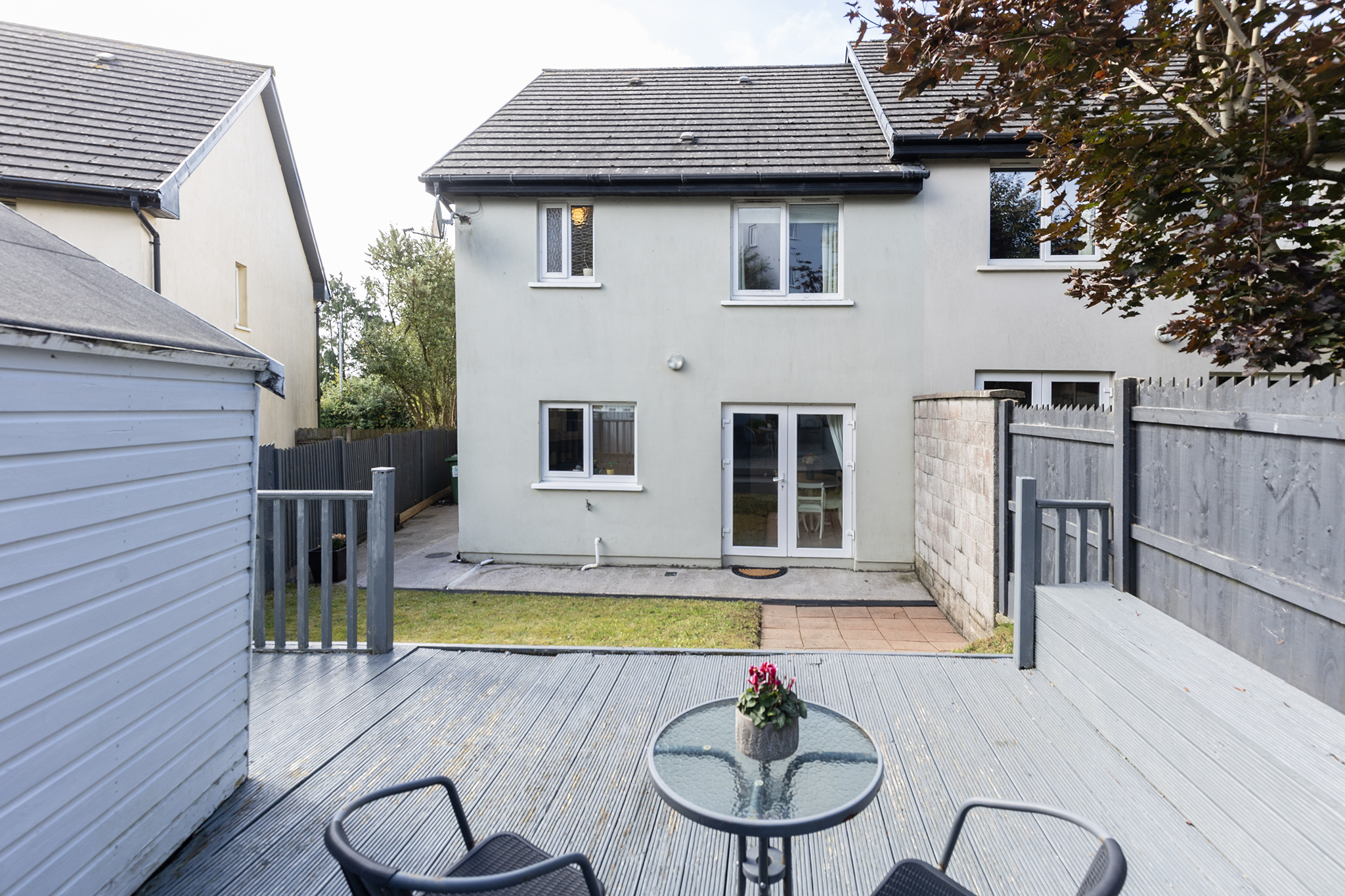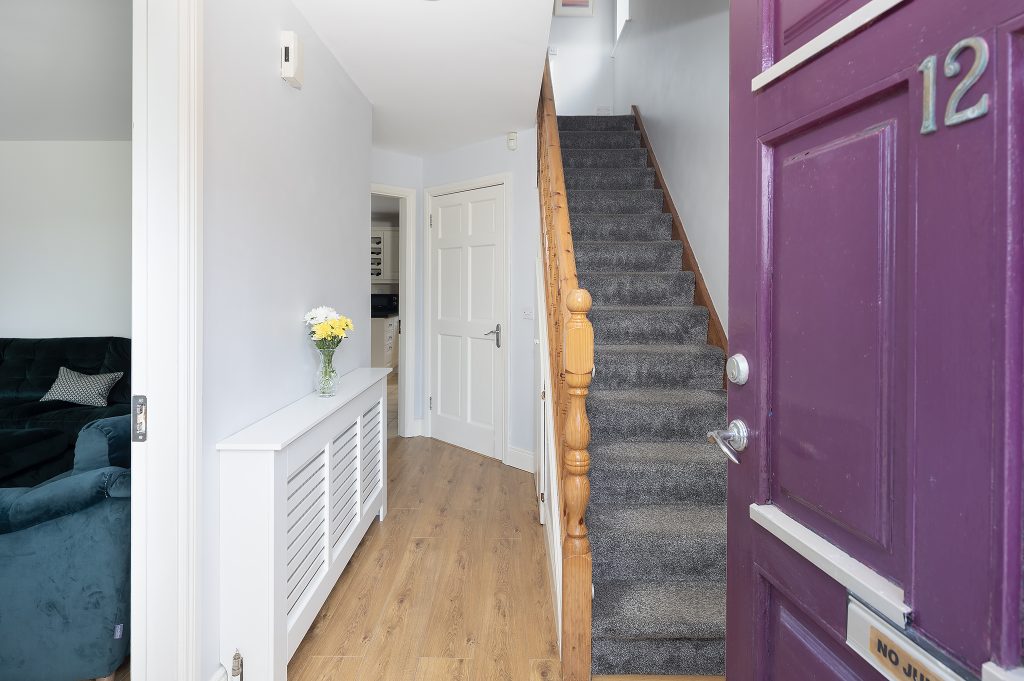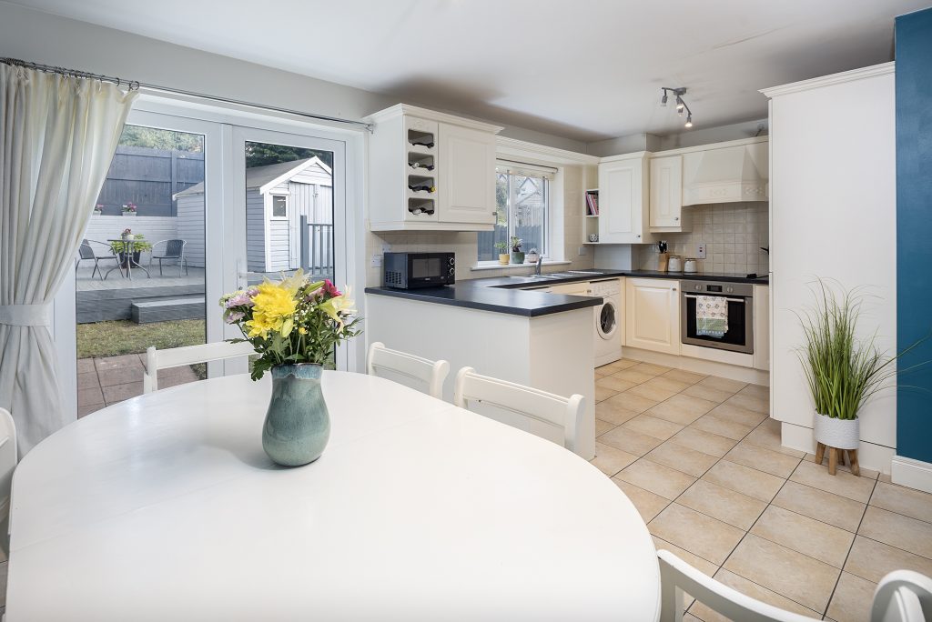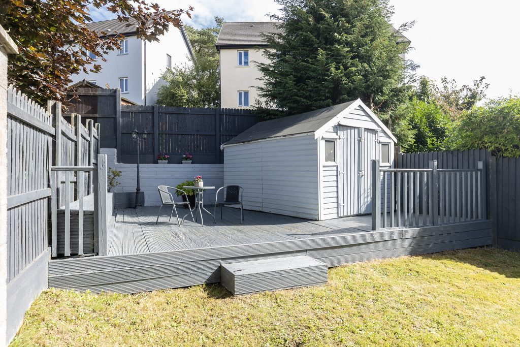 Upon entering, you are greeted by a spacious entrance hall with clever storage tucked neatly beneath the staircase. The ground floor also features a well-sized guest WC, spacious sitting room with an open fireplace, again a spacious kitchen/dining room, where patio doors open onto a generous back garden. This outdoor space is enhanced by a partial deck and a practical garden shed.