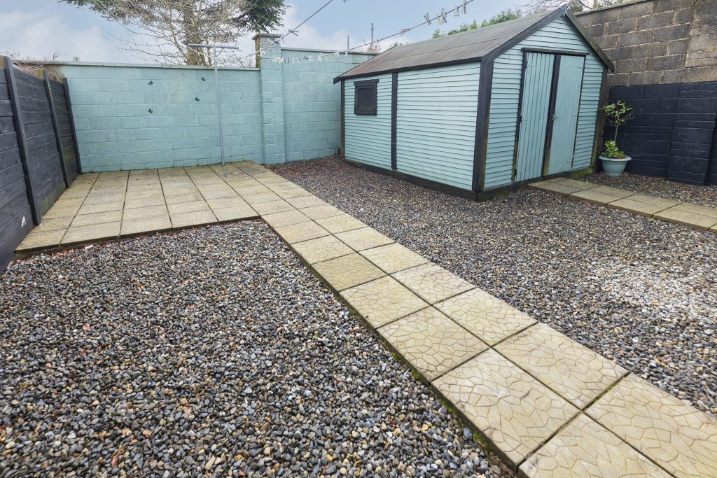 - South-facing rear garden with shed