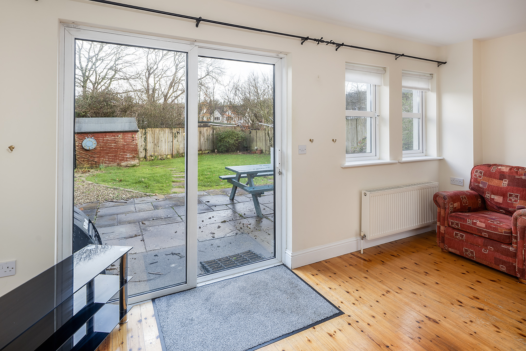 Bright sitting room with patio doors to generous rear garden