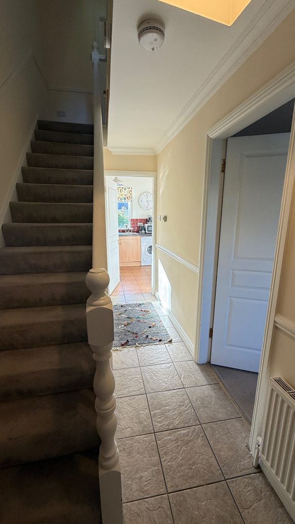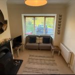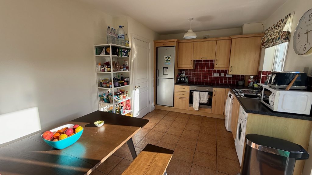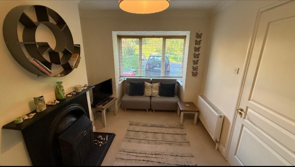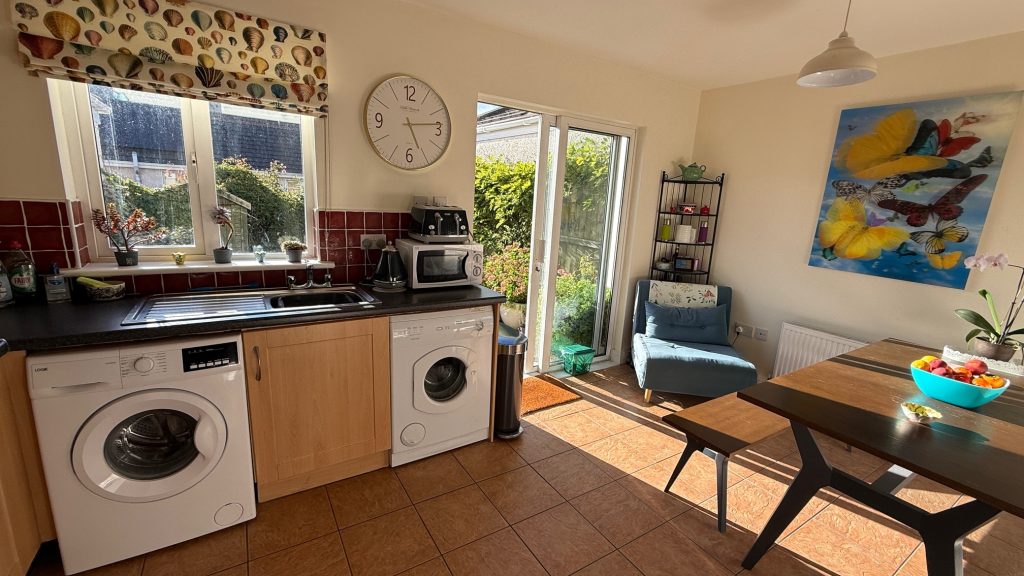 On entering, you are greeted by a tiled hallway. To the right, a bright and welcoming sitting room with an open fireplace sets a cosy tone. The spacious kitchen/dining area is positioned to the rear, complete with patio doors opening directly onto the sunny garden, perfect for outdoor dining and entertaining.