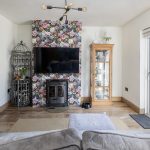 The accommodation briefly comprises a welcoming entrance hall, a versatile ground floor fifth bedroom (ideal as a home office or playroom), guest WC, and a generous living room with open fireplace. Double doors lead to a spacious open-plan kitchen/dining area, complete with a solid fuel stove and direct access to the rear garden via patio doors.